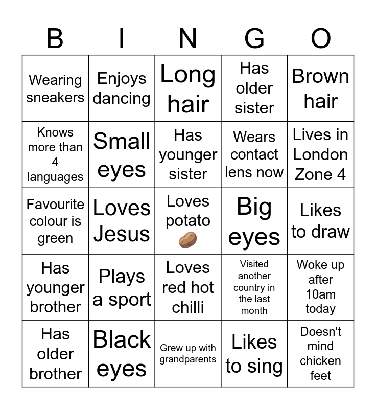 This bingo card has a free space and 24 words: Has older brother, Plays a sport, Has younger sister, Likes to sing, Brown hair, Wearing sneakers, Enjoys dancing, Long hair, Big eyes, Likes to draw, Favourite colour is green, Small eyes, Visited another country in the last month, Woke up after 10am today, Knows more than 4 languages, Black eyes, Grew up with grandparents, Has older sister, Lives in London Zone 4, Has younger brother, Loves Jesus, Loves red hot chilli, Wears contact lens now and Doesn't mind chicken feet.