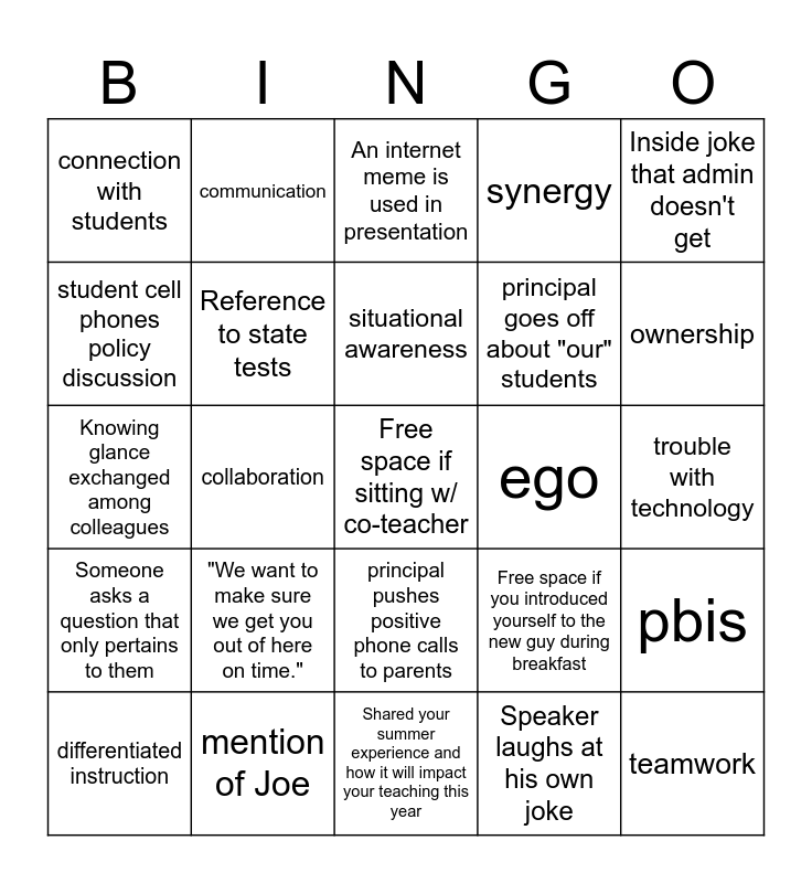 This bingo card has a free space and 29 words: differentiated instruction, someone's phone rings (or someone pretends that it rang so they can leave), collaboration, Ai, connection with students, An internet meme is used in presentation, Reference to state tests, "We want to make sure we get you out of here on time.", ego, mention of Joe, trouble with technology, teamwork, Shared your summer experience and how it will impact your teaching this year, Speaker laughs at his own joke, ownership, standards, principal pushes positive phone calls to parents, Someone asks a question that only pertains to them, Inside joke that admin doesn't get, Knowing glance exchanged among colleagues, Free space if you introduced yourself to the new guy during breakfast, courtesy laughter (cf. speaker laughed at his own joke), principal goes off about "our" students, student cell phones policy discussion, synergy, communication, pbis, situational awareness and classroom phone pockets.