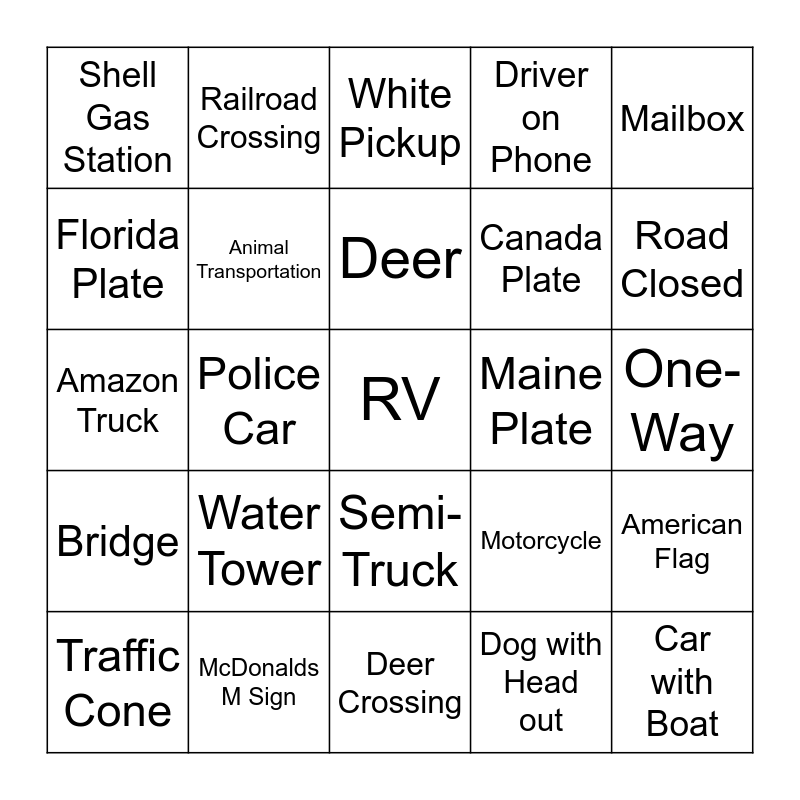 This bingo card has a free space and 24 words: Water Tower, McDonalds M Sign, Deer, Traffic Cone, Mailbox, Shell Gas Station, Florida Plate, Railroad Crossing, Maine Plate, Semi-Truck, Canada Plate, Amazon Truck, Motorcycle, American Flag, Animal Transportation, Dog with Head out, One-Way, White Pickup, Road Closed, Police Car, Car with Boat, Bridge, Driver on Phone and Deer Crossing.