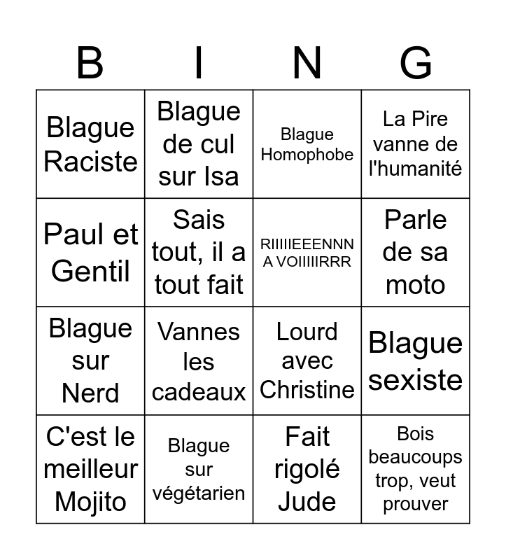 This bingo card has 16 words: Blague sur végétarien, Blague sexiste, Blague Homophobe, Blague Raciste, Blague sur Nerd, Blague de cul sur Isa, Lourd avec Christine, Fait rigolé Jude, Paul et Gentil, Sais tout, il a tout fait, C'est le meilleur Mojito, La Pire vanne de l'humanité, Vannes les cadeaux, Parle de sa moto, RIIIIIEEENNN A VOIIIIIRRR and Bois beaucoups trop, veut prouver.