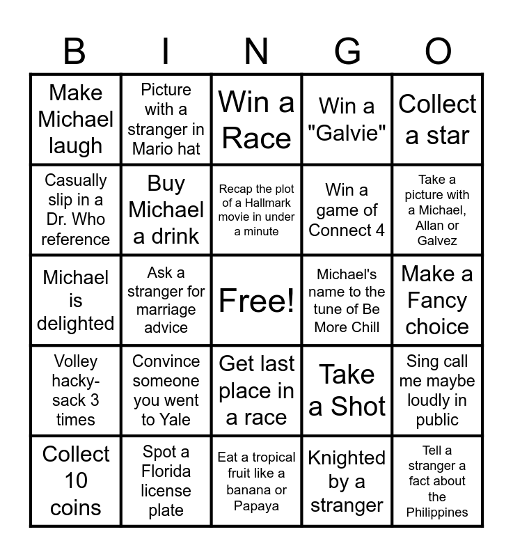 This bingo card has a free space and 24 words: Convince someone you went to Yale, Spot a Florida license plate, Recap the plot of a Hallmark movie in under a minute, Collect 10 coins, Collect a star, Make Michael laugh, Casually slip in a Dr. Who reference, Picture with a stranger in Mario hat, Michael's name to the tune of Be More Chill, Get last place in a race, Win a game of Connect 4, Michael is delighted, Take a Shot, Sing call me maybe loudly in public, Buy Michael a drink, Knighted by a stranger, Make a Fancy choice, Win a Race, Take a picture with a Michael, Allan or Galvez, Ask a stranger for marriage advice, Tell a stranger a fact about the Philippines, Volley hacky-sack 3 times, Win a "Galvie" and Eat a tropical fruit like a banana or Papaya.