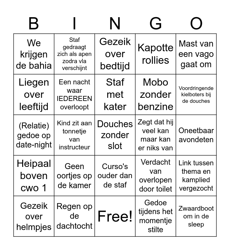 This bingo card has 25 words: Heipaal boven cwo 1, Regen op de dachtocht, Douches zonder slot, Gedoe tijdens het momentje stilte, Mast van een vago gaat om, We krijgen de bahia, Staf gedraagt zich als apen zodra vla verschijnt, Gezeik over bedtijd, Zegt dat hij veel kan maar kan er niks van, Link tussen thema en kamplied vergezocht, Liegen over leeftijd, Een nacht waar IEDEREEN overloopt, Free!, Verdacht van overlopen door toilet, Voordringende kielboters bij de douches, Gezeik over helmpjes, Kind zit aan tonnetje van instructeur, Staf met kater, Mobo zonder benzine, Oneetbaar avondeten, (Relatie) gedoe op date-night, Geen oortjes op de kamer, Curso's ouder dan de staf, Kapotte rollies and Zwaardboot om in de sleep.