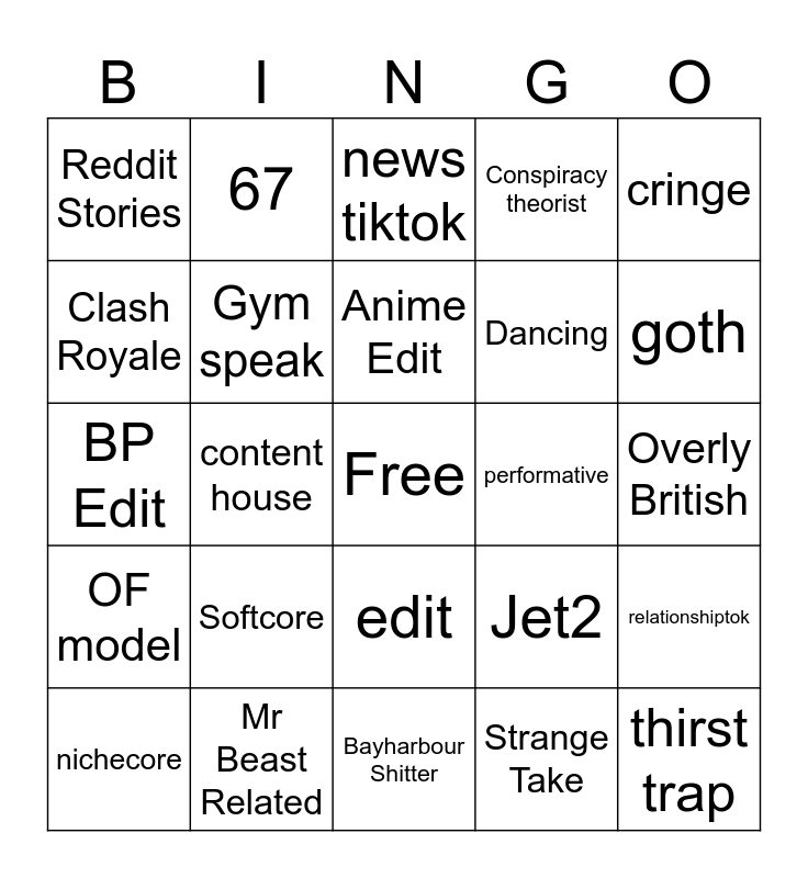 This bingo card has a free space and 24 words: Softcore, Mr Beast Related, Anime Edit, nichecore, cringe, Reddit Stories, Clash Royale, 67, performative, edit, Dancing, BP Edit, Jet2, relationshiptok, Gym speak, Strange Take, Overly British, news tiktok, goth, content house, thirst trap, OF model, Conspiracy theorist and Bayharbour Shitter.