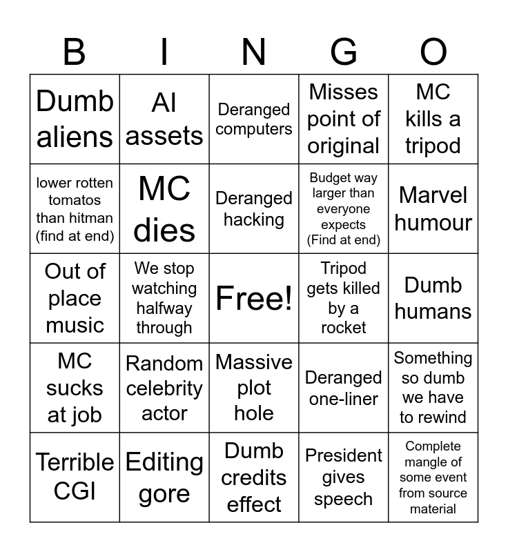 This bingo card has a free space and 34 words: Someone says ‘War of the worlds’, President gives speech, U.S military glaze, MC is a psycho, MC sucks at job, MC dies, MC kills a tripod, Terrible CGI, AI assets, Morbius connection, Deranged hacking, Deranged computers, Deranged desktop, Product placement, Tripod gets killed by a rocket, Marvel humour, Editing gore, Out of place music, Random celebrity actor, Deranged one-liner, Massive plot hole, Second movie, Dumb aliens, Dumb humans, Dumb credits effect, Complete mangle of some event from source material, Misses point of original, Production lore discovery, Budget way larger than everyone expects (Find at end), lower rotten tomatos than hitman (find at end), We lose track of the plot, We stop watching halfway through, Something so dumb we have to rewind and Alex complains about something for 2+ minutes (continuous).