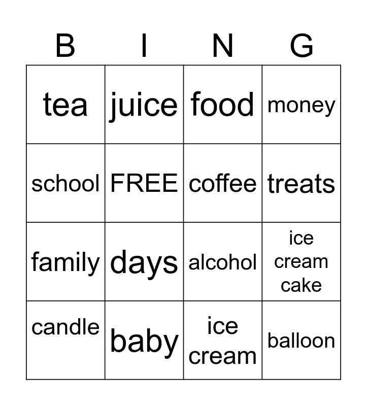 This bingo card has 16 words: baby, ice cream cake, food, tea, family, juice, alcohol, ice cream, school, FREE, candle, money, days, treats, coffee and balloon.