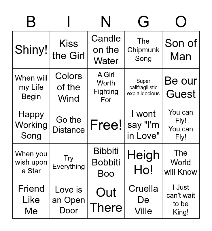 This bingo card has a free space and 24 words: Try Everything, Love is an Open Door, A Girl Worth Fighting For, Friend Like Me, Son of Man, Shiny!, When will my Life Begin, Kiss the Girl, I wont say "I'm in Love", Bibbiti Bobbiti Boo, Super califragilistic expialidocious, Happy Working Song, Heigh Ho!, The World will Know, Colors of the Wind, Cruella De Ville, You can Fly! You can Fly!, Candle on the Water, Be our Guest, Go the Distance, I Just can't wait to be King!, When you wish upon a Star, The Chipmunk Song and Out There.