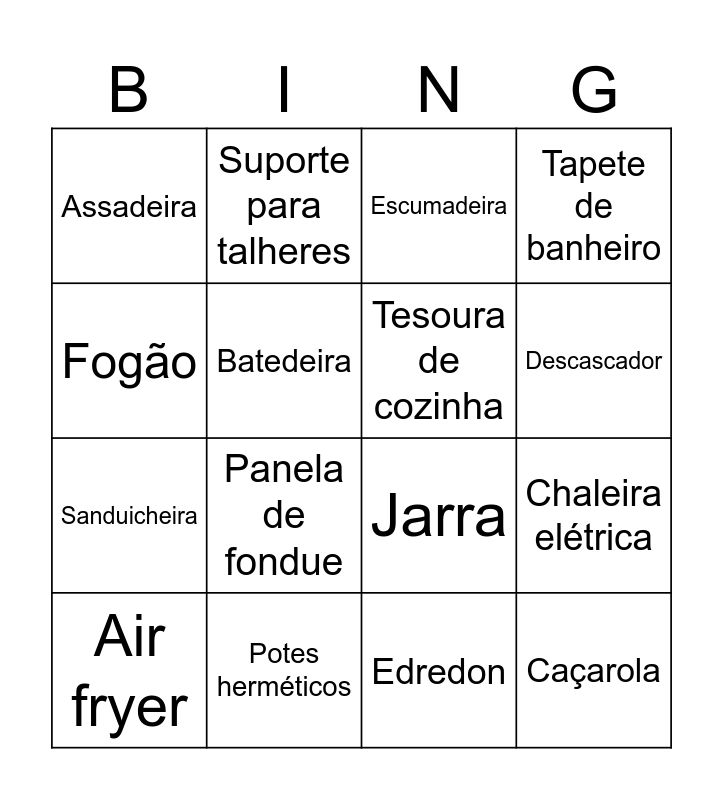 This bingo card has 85 words: Free!, Colher de pau, Escumadeira, Peneira, Espátula, Concha, Faca de pão, Tábua de corte, Abridor de latas, Batedor de arame (fouet), Ralador, Pegador de macarrão, Tesoura de cozinha, Potes herméticos, Medidores (colher/copo), Assadeira, Liquidificador, Batedeira, Micro-ondas, Cafeteira, Torradeira, Sanduicheira, Air fryer, Espremedor de frutas, Chaleira elétrica, Panela elétrica, Xícara, Prato raso, Prato fundo, Copo de vidro, Taça, Travessa, Tigela, Jarra, Molheira, Porta-temperos, Panela de pressão, Frigideira, Caçarola, Panela de fondue, Forma de bolo, Forma de pudim, Leiteira, Avental, Luva térmica, Guardanapo, Saleiro, Açucareiro, Porta-guardanapos, Escorredor de louça, Suporte para talheres, Descascador, Puxa-saco, Lençol, Fronha, Toalha de banho, Travesseiro, Tapete de banheiro, Lixeira, Balde, Toalha de mesa, Pano de prato, Aspirador de pó, Mesa, Geladeira, Fogão, Máquina de lavar, Vassoura, Rodo, Pano de chão, Porta sabonete, Triturador de alho, Ralador, Cafetiera, Cuscuzeira, Saleiro, Açucareiro, Garrafa de café, Kit de pia, Espanador, Edredon, Manta, Cortina, Cobertor and Tábua de corte.
