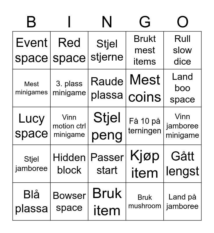This bingo card has 30 words: Bowser space, Vinn minigame, Vinn motion ctrl minigame, Velg 1 på custom dice, Event space, Stjel stjerne, 3. plass minigame, Passer start, Få 10 på terningen, Bruk item, Vinn jamboree minigame, Stjel peng, Bruk mushroom, Land på jamboree, Land boo space, 50 coins, Kjøp item, Stjel jamboree, Hidden block, Rull slow dice, Lucy space, To like terninga, Red space, Mest coins, Mest minigames, Brukt mest items, Gått lengst, Blå plassa, Raude plassa and Bonus stjerne.