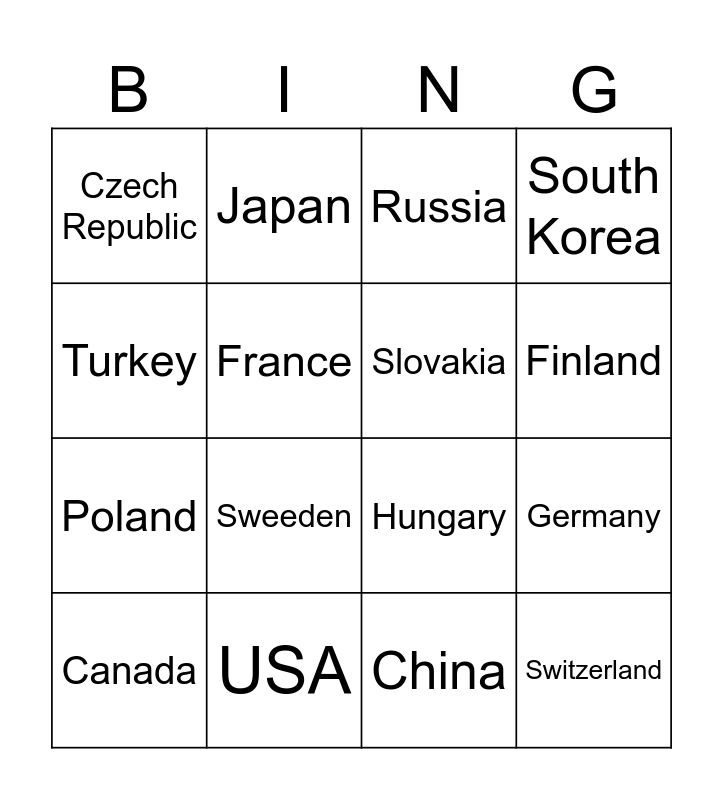 This bingo card has 16 words: USA, Germany, Russia, Czech Republic, Poland, Japan, Hungary, China, Turkey, France, Canada, South Korea, Sweeden, Finland, Slovakia and Switzerland.