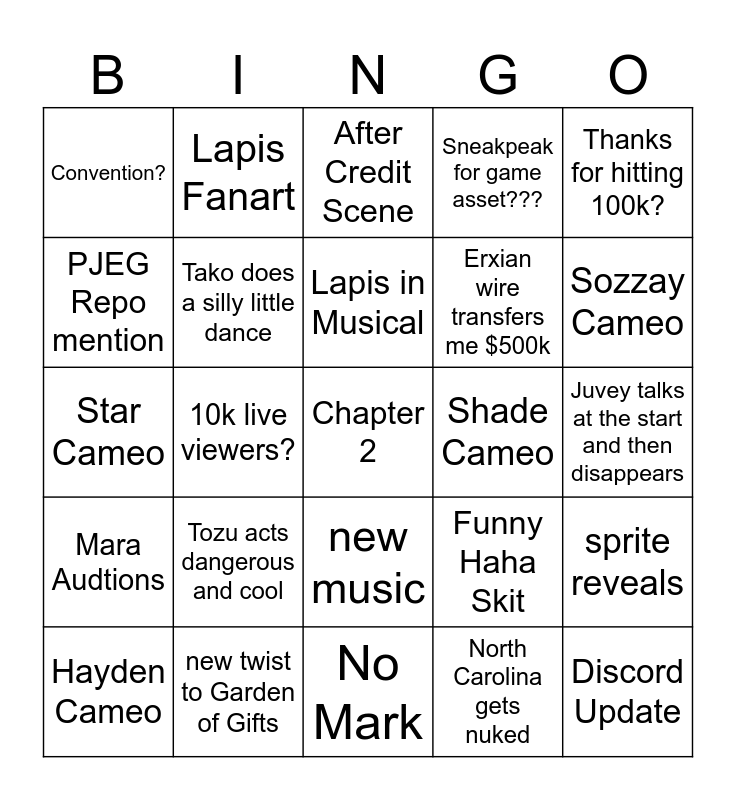 This bingo card has a free space and 24 words: Tozu acts dangerous and cool, new twist to Garden of Gifts, Lapis in Musical, Hayden Cameo, Thanks for hitting 100k?, Convention?, PJEG Repo mention, Lapis Fanart, Shade Cameo, new music, Erxian wire transfers me $500k, Star Cameo, Funny Haha Skit, sprite reveals, Tako does a silly little dance, North Carolina gets nuked, Juvey talks at the start and then disappears, After Credit Scene, Sozzay Cameo, 10k live viewers?, Discord Update, Mara Audtions, Sneakpeak for game asset??? and No Mark.