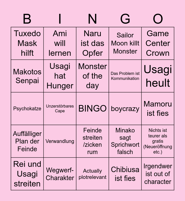 This bingo card has a free space and 24 words: Verwandlung, Wegwerf- Charakter, Monster of the day, Rei und Usagi streiten, Game Center Crown, Tuxedo Mask hilft, Makotos Senpai, Ami will lernen, boycrazy, Feinde streiten /zicken rum, Das Problem ist Kommunikation, Psychokatze, Minako sagt Sprichwort falsch, Nichts ist teurer als gratis (Neueröffnung etc.), Usagi hat Hunger, Chibiusa ist fies, Mamoru ist fies, Naru ist das Opfer, Usagi heult, Unzerstörbares Cape, Irgendwer ist out of character, Auffälliger Plan der Feinde, Sailor Moon killt Monster and Actually plotrelevant.