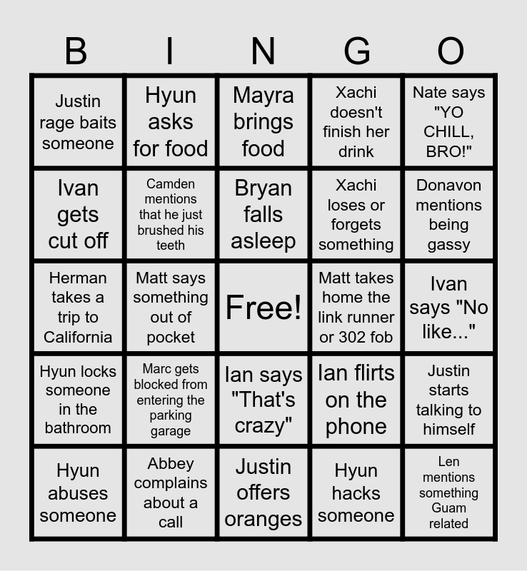This bingo card has a free space and 24 words: Marc gets blocked from entering the parking garage, Abbey complains about a call, Bryan falls asleep, Hyun abuses someone, Nate says "YO CHILL, BRO!", Justin rage baits someone, Ivan gets cut off, Hyun asks for food, Matt takes home the link runner or 302 fob, Ian says "That's crazy", Xachi loses or forgets something, Herman takes a trip to California, Ian flirts on the phone, Justin starts talking to himself, Camden mentions that he just brushed his teeth, Hyun hacks someone, Ivan says "No like...", Mayra brings food, Donavon mentions being gassy, Matt says something out of pocket, Len mentions something Guam related, Hyun locks someone in the bathroom, Xachi doesn't finish her drink and Justin offers oranges.
