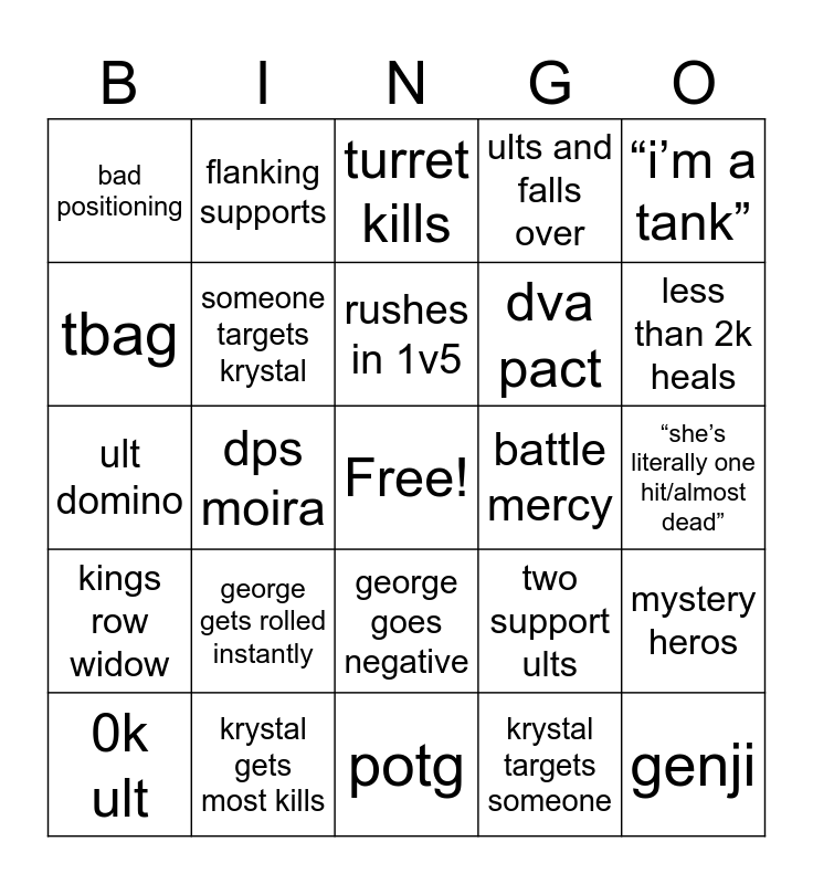 This bingo card has a free space and 24 words: george gets rolled instantly, krystal gets most kills, rushes in 1v5, 0k ult, “i’m a tank”, bad positioning, tbag, flanking supports, battle mercy, george goes negative, dva pact, ult domino, two support ults, mystery heros, someone targets krystal, krystal targets someone, “she’s literally one hit/almost dead”, turret kills, less than 2k heals, dps moira, genji, kings row widow, ults and falls over and potg.