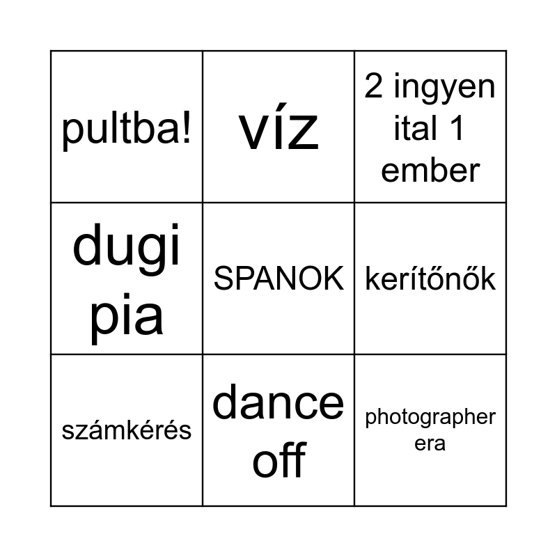 This bingo card has a free space and 8 words: kerítőnők, 2 ingyen ital 1 ember, víz, számkérés, pultba!, photographer era, dugi pia and dance off.