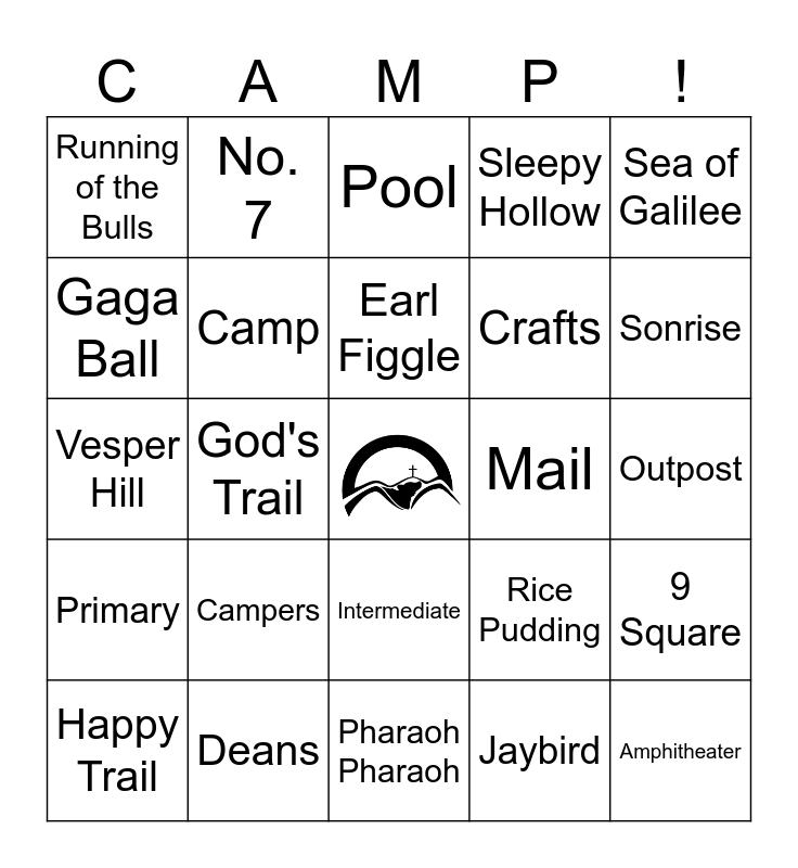 This bingo card has a free space and 74 words: 1966, Bear, Pool, Vespers, Chapel, SoMo, Mountain, Cabins, Happy Trail, Chicken Alfredo, Campfire, Dining Hall, Earl Figgle, Gaga Ball, Cinnamon Rolls, God's Trail, Markleysburg, Sonrise, Flagpole, Vesper Hill, Camp, No. 7, Sleepy Hollow, Ballfield, Amphitheater, DBGWTJ, Hey Y'all, Summer, Lovers Lane, Upper Room, Sea of Galilee, Hiking, Birdie Song, Pine Tree, Mountaintop, Jaybird, Cross, Exodus 34:2, Blessed Assurance, Retreats, Pharaoh Pharaoh, Deans, Trailblazer, The Bear Song, Second Story Window, Running of the Bulls, Luke 9:23, Campers, Senior High, Counselors, Junior High, Devotions, Outpost, Gethsemane, Class, Talent Night, Intermediate, Nature, Jesus, 9 Square, Crafts, Rise & Shine, Primary, Bocce Ball, Mail, Joy is the Flag, Sanctuary, Music, Rice Pudding, Prayer, Worship, Fall Retreat, Arctic Blast and Caney Valley.