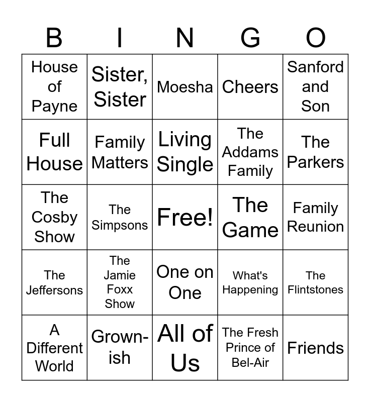 This bingo card has a free space and 34 words: Good Times, The Fresh Prince of Bel-Air, Golden Girls, Girlfriends, The Jeffersons, Family Matters, Sanford and Son, A Different World, Sister, Sister, Martin, Living Single, Moesha, Abbott Elementary, Black-ish, The Game, The Parkers, Grown-ish, The Cosby Show, The Jamie Foxx Show, What's Happening, One on One, The Proud Family, House of Payne, Family Reunion, All of Us, Friends, Cheers, The Brady Bunch, The Addams Family, Full House, Grey's Anatomy, The Simpsons, The Flintstones and Amen.