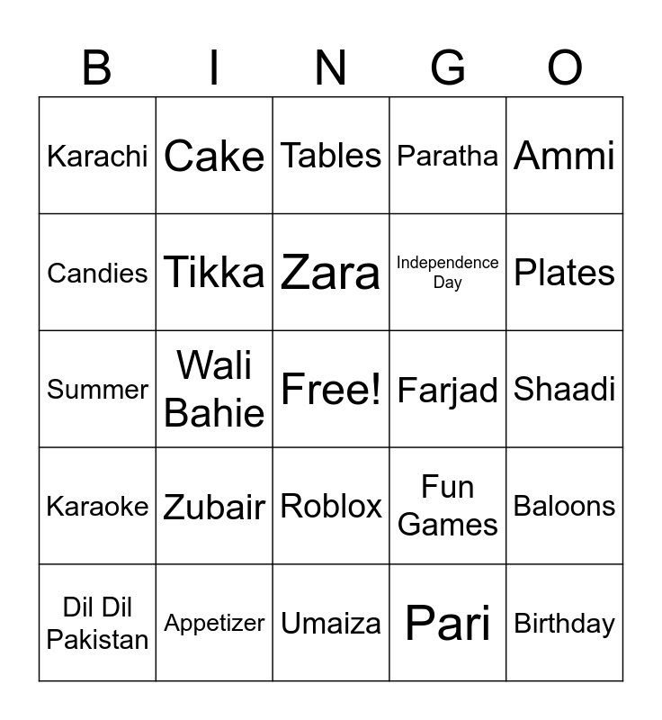 This bingo card has a free space and 50 words: Pakistan, Birthday, Zaryab, Umaiza, Zubair, B.B.Q, Cake, Celebration, Candies, Qorma, Tikka, Paratha, Baloons, Fun Games, Almir, Saif, Zara, Farjad, Khans Family, Ammi, Wali Bahie, Pari, Karachi, Independence Day, Chutney, Rayyan, Plates, Spoon, Tables, Roblox, Pacman, Spiderman, Ironman, Pizza, Appetizer, Kinza, Faiza, Anum, Police, Shaadi, Dholki, Shalima, Milton, Canada, Dil Dil Pakistan, Summer, Aliza, Mautanjan, Karaoke and Singing.