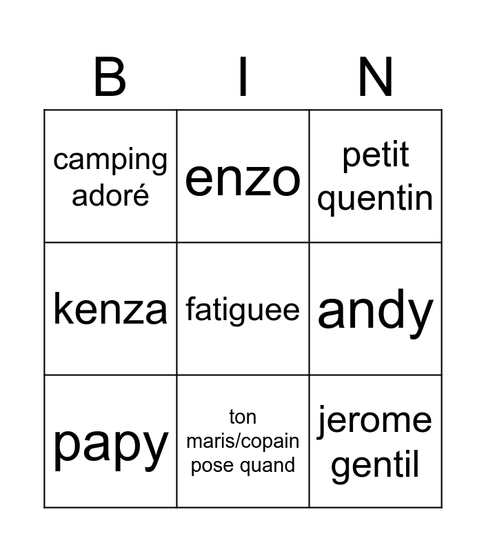 This bingo card has a free space and 8 words: andy, petit quentin, enzo, papy, camping adoré, jerome gentil, kenza and ton maris/copain pose quand.