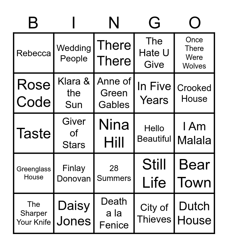 This bingo card has 25 words: Finlay Donovan, Death a la Fenice, Anne of Green Gables, The Sharper Your Knife, Once There Were Wolves, Rebecca, Rose Code, Wedding People, Hello Beautiful, 28 Summers, In Five Years, Taste, Still Life, Bear Town, Klara & the Sun, Dutch House, I Am Malala, There There, Crooked House, Giver of Stars, Nina Hill, Daisy Jones, Greenglass House, The Hate U Give and City of Thieves.