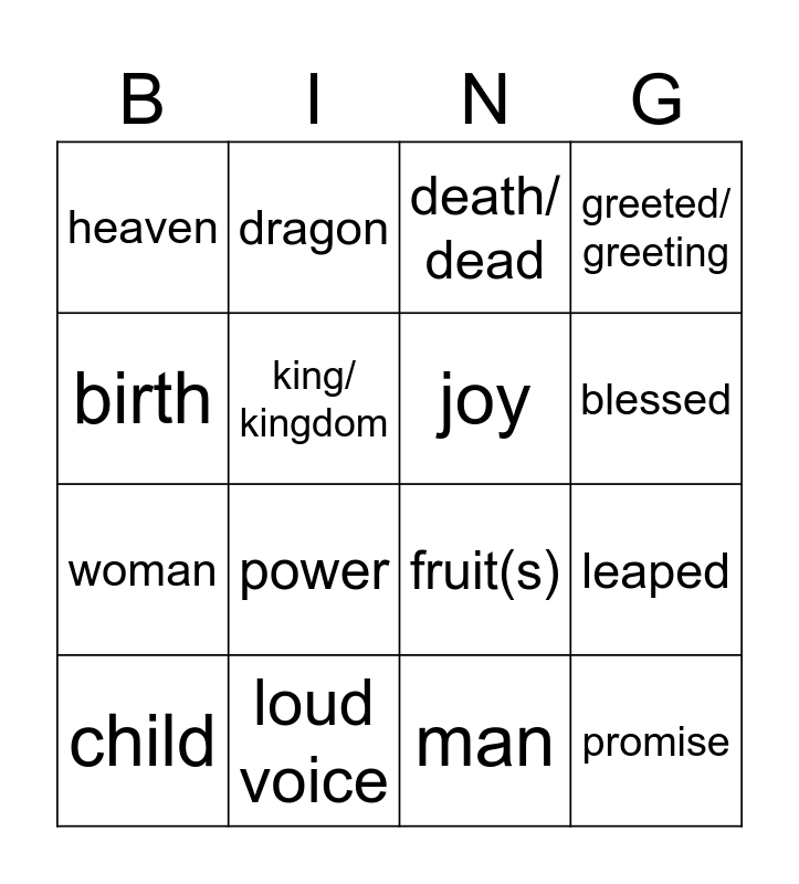This bingo card has 16 words: child, loud voice, death/ dead, greeted/ greeting, birth, dragon, fruit(s), leaped, heaven, king/ kingdom, man, blessed, woman, power, joy and promise.