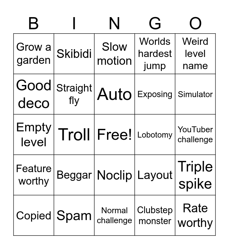 This bingo card has a free space and 24 words: Beggar, Spam, Auto, Copied, Weird level name, Grow a garden, Good deco, Skibidi, Lobotomy, Noclip, Exposing, Empty level, Layout, Triple spike, Straight fly, Clubstep monster, YouTuber challenge, Slow motion, Simulator, Troll, Rate worthy, Feature worthy, Worlds hardest jump and Normal challenge.