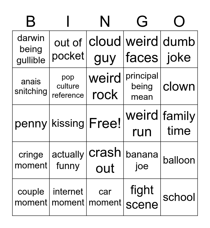 This bingo card has a free space and 35 words: richard being dumb, weird dances, darwin being smart, pop culture reference, crash out, weird faces, anais snitching, voice changes, weird rock, larry, penny, dumb joke, innuendo, naked, darwin being gullible, weird run, fight scene, kissing, cringe moment, school, banana joe, couple moment, balloon, internet moment, cloud guy, clown, joyful burger, mall, principal being mean, family time, gyatt, car moment, actually funny, out of pocket and explosion.