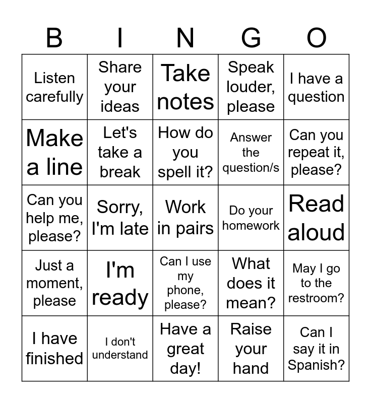 This bingo card has 25 words: Just a moment, please, I don't understand, Work in pairs, Raise your hand, I have a question, Listen carefully, Share your ideas, Take notes, Do your homework, May I go to the restroom?, Make a line, Let's take a break, Have a great day!, What does it mean?, Can you repeat it, please?, I have finished, Sorry, I'm late, How do you spell it?, Answer the question/s, Read aloud, Can you help me, please?, I'm ready, Can I use my phone, please?, Speak louder, please and Can I say it in Spanish?.