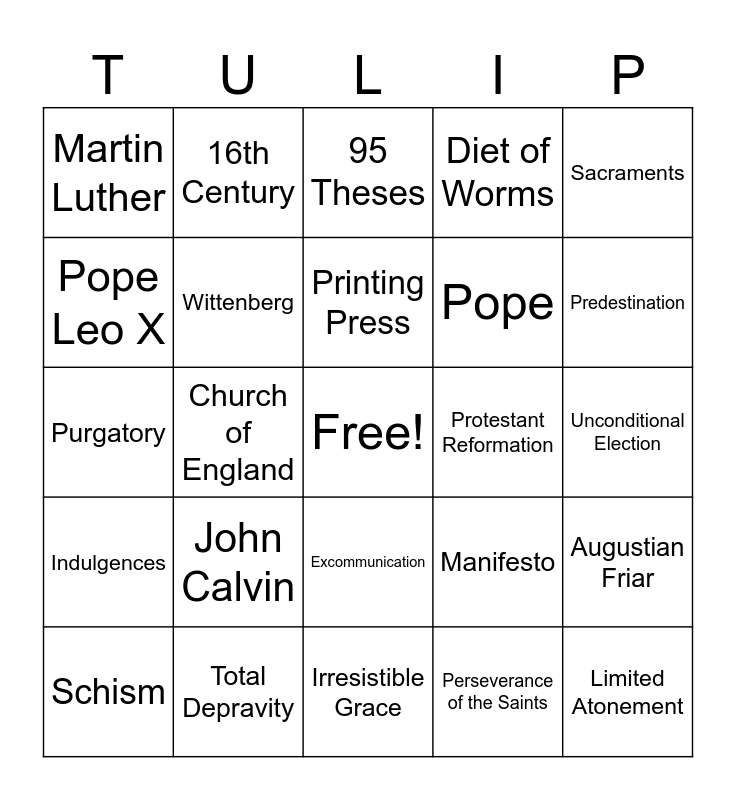 This bingo card has a free space and 29 words: Schism, Calvinism, Church of England, Protestantism, Martin Luther, 95 Theses, Wittenberg, John Calvin, Protestant Reformation, Total Depravity, Unconditional Election, Limited Atonement, Irresistible Grace, Perseverance of the Saints, Predestination, Doctrine, Excommunication, Indulgences, Sacraments, Purgatory, Manifesto, Repentance, Pope, Pope Leo X, Diet of Worms, 16th Century, Augustian Friar, Printing Press and A Mighty Fortress is Our God.