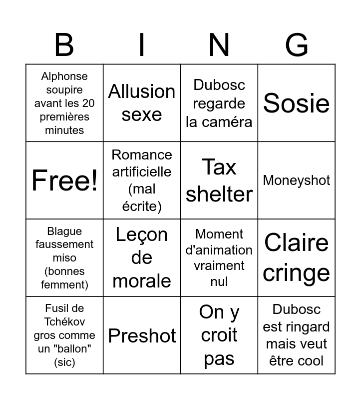 This bingo card has 16 words: Preshot, Claire cringe, Dubosc regarde la caméra, Alphonse soupire avant les 20 premières minutes, Blague faussement miso (bonnes femment), Allusion sexe, Moment d'animation vraiment nul, On y croit pas, Free!, Romance artificielle (mal écrite), Fusil de Tchékov gros comme un "ballon" (sic), Sosie, Leçon de morale, Moneyshot, Tax shelter and Dubosc est ringard mais veut être cool.