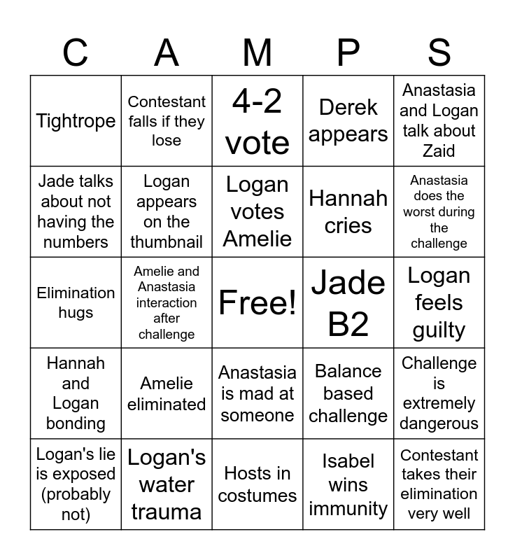 This bingo card has a free space and 24 words: Logan's lie is exposed (probably not), Amelie eliminated, Logan votes Amelie, Isabel wins immunity, Anastasia and Logan talk about Zaid, Tightrope, Contestant falls if they lose, 4-2 vote, Jade B2, Logan feels guilty, Elimination hugs, Logan appears on the thumbnail, Balance based challenge, Challenge is extremely dangerous, Jade talks about not having the numbers, Logan's water trauma, Hosts in costumes, Derek appears, Anastasia does the worst during the challenge, Hannah and Logan bonding, Amelie and Anastasia interaction after challenge, Anastasia is mad at someone, Hannah cries and Contestant takes their elimination very well.