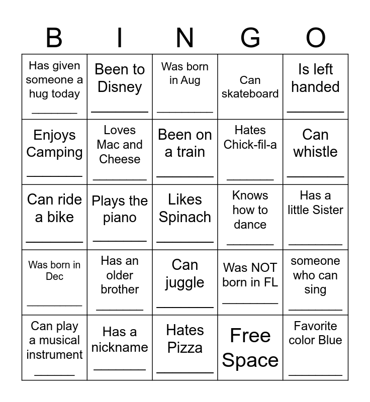 This bingo card has 30 words: Has a nickname _______, Is wearing jeans ________, Plays the piano _______, Has a Dog _______, Has given someone a hug today _______, Was born in Aug _________, Loves Mac and Cheese ________, Can juggle _______, Knows how to dance _______, Hates Pizza _______, Has a little Sister ________, Likes Spinach _______, Free Space, Favorite color Blue ________, Can whistle _______, Plays basketball _______, Was NOT born in FL ________, Was born in Dec __________, Has an older brother _______, Is left handed _______, Can ride a bike _______, Speaks at least 2 languages _______, Been to Disney _______, Hates Chick-fil-a _______, Enjoys Camping _______, Can skateboard, someone who can sing ________, Can play a musical instrument ______, Been on a train _______ and Loves Pineapple pizza _______.