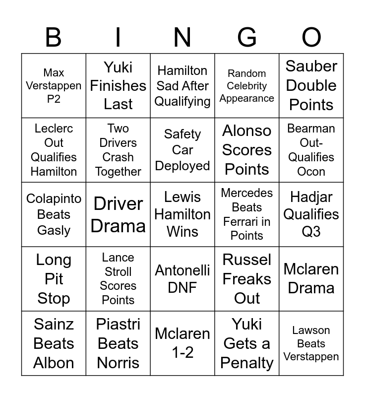 This bingo card has a free space and 24 words: Lance Stroll Scores Points, Piastri Beats Norris, Safety Car Deployed, Sainz Beats Albon, Sauber Double Points, Max Verstappen P2, Leclerc Out Qualifies Hamilton, Yuki Finishes Last, Mercedes Beats Ferrari in Points, Antonelli DNF, Alonso Scores Points, Colapinto Beats Gasly, Russel Freaks Out, Mclaren Drama, Two Drivers Crash Together, Yuki Gets a Penalty, Hadjar Qualifies Q3, Hamilton Sad After Qualifying, Bearman Out-Qualifies Ocon, Driver Drama, Lawson Beats Verstappen, Long Pit Stop, Random Celebrity Appearance and Mclaren 1-2.