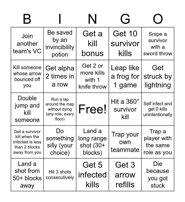 This bingo card has a free space and 24 words: Do something silly (your choice), Hit 3 shots consecutively, Get 2 or more kills with 1 knife throw, Land a shot from 50+ blocks away, Snipe a survivor with a sword throw, Join another team's VC, Kill someone whose arrow bounced off you, Be saved by an invincibility potion, Hit a 360° survivor kill, Land a long range shot (30+ blocks), Leap like a frog for 1 game, Double jump and kill someone, Trap your own teammate, Trap a player with the same role as you, Get alpha 2 times in a row, Get 3 arrow refills, Self infect and get 0 kills unintentionally, Get a kill bonus, Get struck by lightning, Run a lap around the map without dying (any role, every floor), Die because you got stuck, Get a survivor kill when the infected is less than 2 blocks away from you, Get 10 survivor kills and Get 5 infected kills.