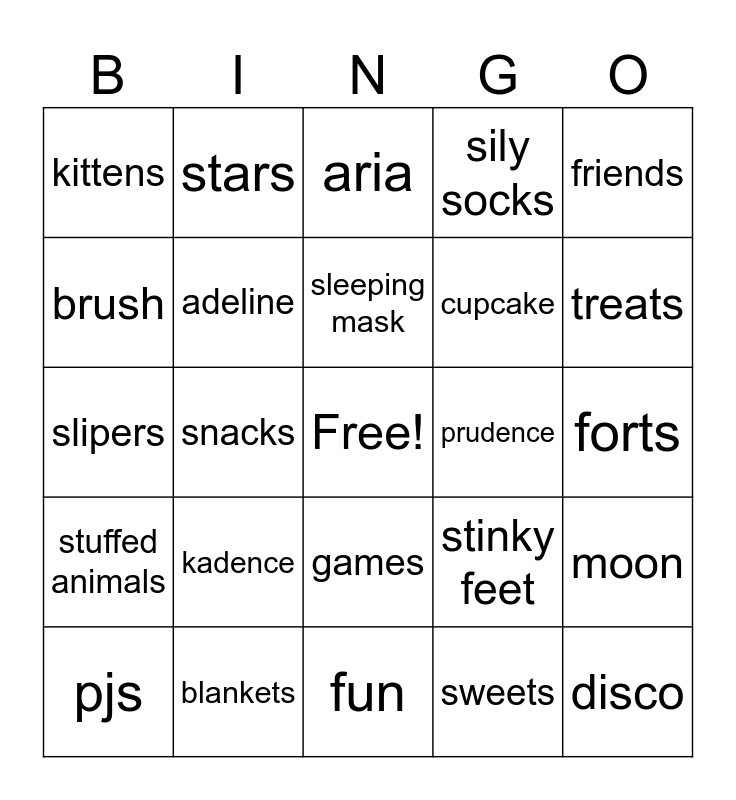 This bingo card has a free space and 29 words: pjs, pillows, snacks, puppies, kittens, aria, adeline, kadence, prudence, blankets, forts, disco, fun, sweets, treats, silly, games, stuffed animals, friends, slipers, stinky feet, party time, cupcake, brush, sily socks, stars, moon, sleeping mask and pillow fight.