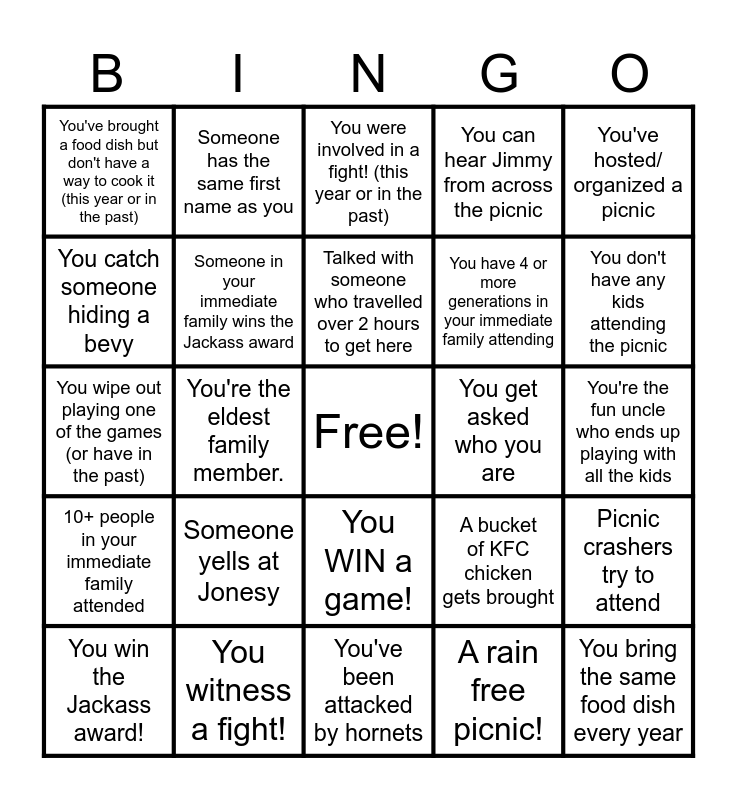 This bingo card has a free space and 24 words: Someone yells at Jonesy, You witness a fight!, Talked with someone who travelled over 2 hours to get here, You win the Jackass award!, You've hosted/ organized a picnic, You've brought a food dish but don't have a way to cook it (this year or in the past), You catch someone hiding a bevy, Someone has the same first name as you, You get asked who you are, You WIN a game!, You have 4 or more generations in your immediate family attending, You wipe out playing one of the games (or have in the past), A bucket of KFC chicken gets brought, Picnic crashers try to attend, Someone in your immediate family wins the Jackass award, A rain free picnic!, You're the fun uncle who ends up playing with all the kids, You were involved in a fight! (this year or in the past), You don't have any kids attending the picnic, You're the eldest family member., You bring the same food dish every year, 10+ people in your immediate family attended, You can hear Jimmy from across the picnic and You've been attacked by hornets.