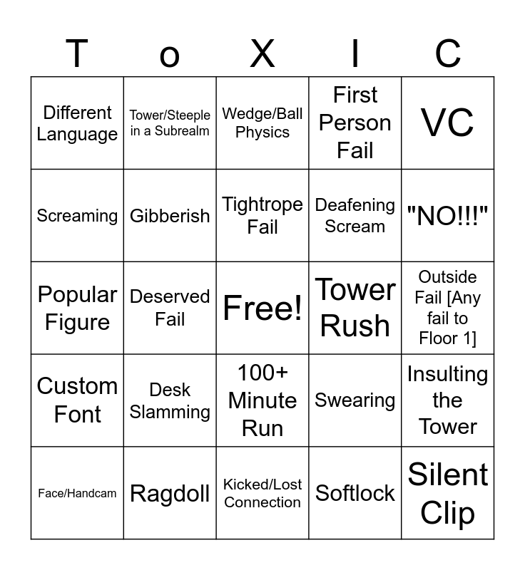 This bingo card has a free space and 24 words: Desk Slamming, Ragdoll, Tightrope Fail, Face/Handcam, VC, Different Language, Screaming, Tower/Steeple in a Subrealm, Tower Rush, 100+ Minute Run, Deafening Scream, Popular Figure, Swearing, Insulting the Tower, Gibberish, Softlock, Outside Fail [Any fail to Floor 1], Wedge/Ball Physics, "NO!!!", Deserved Fail, Silent Clip, Custom Font, First Person Fail and Kicked/Lost Connection.