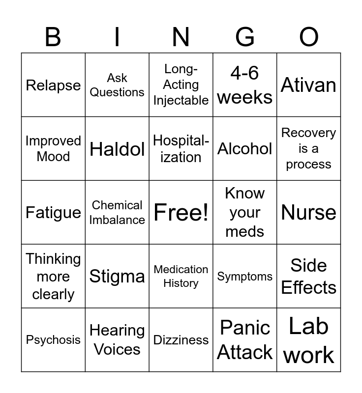 This bingo card has a free space and 54 words: Prozac, Stigma, Dry-Mouth, Anxiety, Nurse, Med-Compliance, Haldol, Break Through Symptoms, 4-6 weeks, Agitation, Relapse, Self-Medicating, Panic Attack, Side Effects, Lithium, SSRIs, Hospital- ization, Alcohol, Pills don't teach skills, Psychosis, Hearing Voices, Dizziness, Know your meds, Ativan, Talk to your Doctor, Ask Questions, Medication History, Coping Skills, Mood Stabilizers, Take as directed, Depakote, Bipolar Disorder, Group Therapy, Tremors, Improved Mood, Weight gain, Long-Acting Injectable, Symptoms, Lab work, Fatigue, Take with food, Insomnia, Extended Release, Listen to music, Over the Counter, Every 12 hours, Help you achieve your goals, Sam the Nurse, Recovery is a process, Thinking more clearly, Chemical Imbalance, Hope, Medication Times and Not a cure.