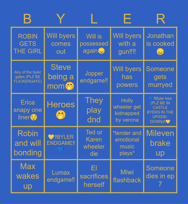 This bingo card has a free space and 24 words: 💛‼️BYLER ENDGAME‼️💙, Lumax endgame‼️, Jopper endgame‼️, Max wakes up, Jonathan is cooked😞, ROBIN GETS THE GIRL, Any of the byler gates (PLZ BE FLICKERGATE), Will byers comes out, Holly wheeler get kidnapped by vercna, Ted or Karen wheeler die, Will byers has powers, Erica snapy one liner😌, *tender and emotional music plays*, Mileven brake up, Steve being a mom🤭, Miwi flashback, 💙‼️Byler kiss (PLZ BE IN CASTLE BYERS IN THE UPSIDE-DOWN)‼️💛, Will is possessed again😞, Someone gets murryed, Heroes🤭, Someone dies in ep 7, Robin and will bonding, Will byers with a gun‼️‼️ and El sacrifices herself.