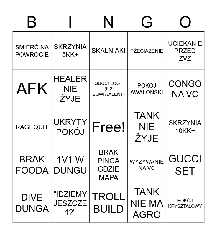 This bingo card has a free space and 85 words: MORGANA, CHERETYCY, SKALNIAKI, BUFF NA FAME, BUFF NA SILVER, ZŁOTA, FIOLETOWA, NIEBIESKA, ZIELONNA, SKRZYNIA Z KSIAZKAMI, PARTY 7 OSOBOWE, WIPE PARTY, HEALER NIE ŻYJE, TANK NIE ŻYJE, ŚMIERĆ NA DOJEŹDZIE, ŚMIERĆ NA POWROCIE, DIVE DUNGA, AFK, "KTO STAWIA MAPKE?", "NIE DAMY RADY TEGO ZROBIĆ", PARTY NIE UMIE DODGOWAĆ, POKÓJ AWALOŃSKI, POKÓJ KRYSZTAŁOWY, POKÓJ Z DWOMA BOSSAMI, UKRYTY POKÓJ, 2 PIĘTRO, 3 PIĘTRO, 4 PIĘTRO, 5 PIĘTRO, FREE!, 1V1 W DUNGU, TANK TROLUJE, HEAL TROLUJE, RAGEQUIT, ZJEBANE PYTANIE, ZA NISKIE IP, TROLL BUILD, SŁABY DPS, BRAK FOODA, CONGO NA VC, DUNG POD PORTALEM, DUNG 1 MAPA OD PORTALU, DUNG 2 MAPY OD PORTALU, BRAK KASY NA SETA, MAGU NA KONTENCIE, PARTY ZŁOŻONE Z WIĘKSZOŚCI OFICERKI, SPÓŹNIENIE, NIEUMIEJĘTNY DOJAZD, SKRZYNIA 1KK+, SKRZYNIA 500K-, SKRZYNIA 5KK+, GUCCI LOOT (6.3 EQWIWALENT), GUCCI LOOT (7.3 EQWIWALENT, GUCCI LOOT (8.3 EQWIWALENT, LUCKY LOOT X.4, "DISBAND?", "IDZIEMY JESZCZE 1?", PŻECIĄŻENIE, SKŁADKA NA MAPE, MAPA 7.3, MAPA 8.3, BRAK POTEK, BRAK SKIP SETA, PODJĘCIE PARTÓWKI DIVUJĄCEJ, UCIEKANIE PRZED PK, UCIEKANIE PRZED ZVZ, RANDOMOWY KRYSZTAŁOWY STWOREK ZABITY, GUCCI SET, 1500IP+, 1600IP+, 1700IP+, 1800IP+, KTOŚ WZIĄŁ MŁOTEK NA DUNGA Z SKALNIAKAMI, ZŁA MAPA, ZPOPOWANIE SOLÓWKI ZAMIAST GRÓPÓWKI, BRAK PINGA GDZIE MAPA, TANK NIE MA AGRO, SAME MELE DPS, SAME RDPS, BRAK MANY, SKRZYNIA 10KK+, Z/W, SŁABY MOUNT, WYZYWANIE NA VC and PUSZCZANIE BINDOW NA VC.