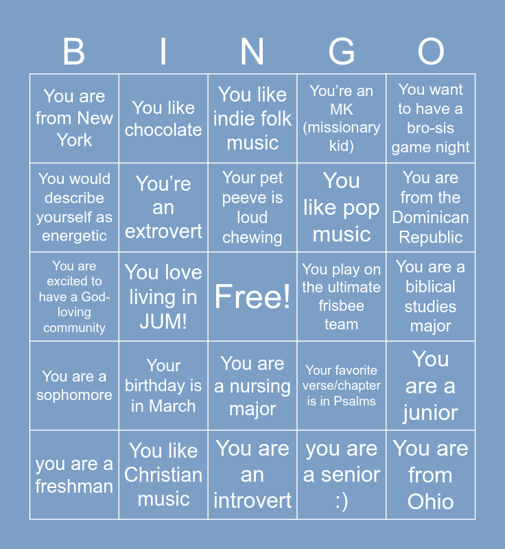 This bingo card has a free space and 24 words: Your birthday is in March, You like Christian music, Your pet peeve is loud chewing, you are a freshman, You want to have a bro-sis game night, You are from New York, You would describe yourself as energetic, You like chocolate, You play on the ultimate frisbee team, You are a nursing major, You like pop music, You are excited to have a God-loving community, Your favorite verse/chapter is in Psalms, You are a junior, You’re an extrovert, you are a senior :), You are a biblical studies major, You like indie folk music, You are from the Dominican Republic, You love living in JUM!, You are from Ohio, You are a sophomore, You’re an MK (missionary kid) and You are an introvert.