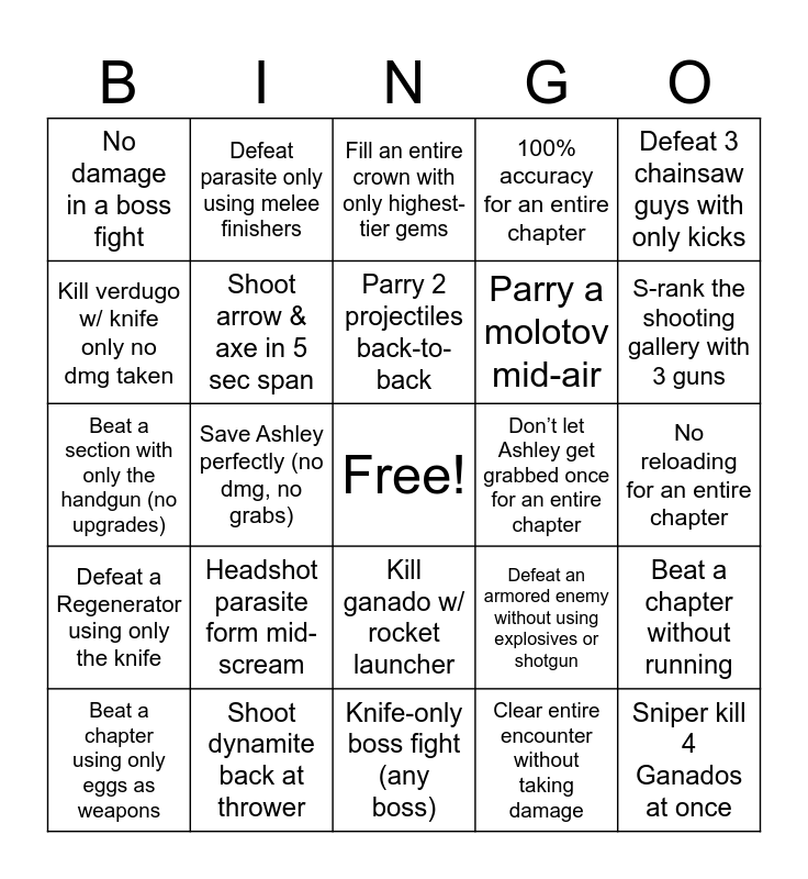 This bingo card has a free space and 25 words: Headshot parasite form mid-scream, Knife-only boss fight (any boss), Parry 2 projectiles back-to-back, Beat a chapter using only eggs as weapons, Defeat 3 chainsaw guys with only kicks, No damage in a boss fight, Kill verdugo w/ knife only no dmg taken, Defeat parasite only using melee finishers, Don’t let Ashley get grabbed once for an entire chapter, Kill ganado w/ rocket launcher, Parry a molotov mid-air, Beat a section with only the handgun (no upgrades), Defeat an armored enemy without using explosives or shotgun, Beat a chapter without running, Shoot arrow & axe in 5 sec span, No healing for an entire chapter, No reloading for an entire chapter, Fill an entire crown with only highest-tier gems, S-rank the shooting gallery with 3 guns, Save Ashley perfectly (no dmg, no grabs), Sniper kill 4 Ganados at once, Shoot dynamite back at thrower, Defeat a Regenerator using only the knife, 100% accuracy for an entire chapter and Clear entire encounter without taking damage.