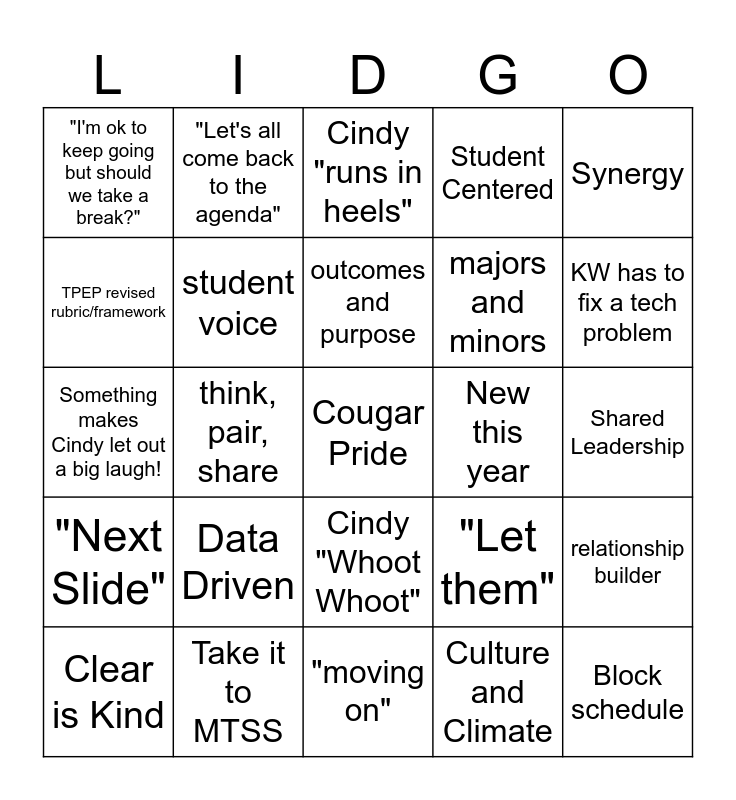 This bingo card has a free space and 44 words: SBA, Block schedule, "There's going to be some changes", Clear is Kind, ChatGPT/AI, Culture and Climate, Cindy "runs in heels", Kristin "writes in green notebook", Synergy, Take it to MTSS, Student Centered, New this year, Cindy "Whoot Whoot", Data Driven, "click on the link", "moving on", "I don't know why that's not working", Something makes Cindy let out a big laugh!, Check with Becky, KW has to fix a tech problem, "Let's all come back to the agenda", "Social emotional learning", "Do we need a break?", "I'm ok to keep going but should we take a break?", culturally responsive teaching, Shared Leadership, "Make it a Great Day", "Cougar Pride Please", "Let them", "Next Slide", forced to talk to someone new, relationship builder, There are at least 10 office chairs in the cafeteria, gallery walk, think, pair, share, C/K beg you to eat, "We know it's hot outside", "We know you have a million things to do", outcomes and purpose, TPEP revised rubric/framework, majors and minors, with fidelity, student voice and tight/loose.