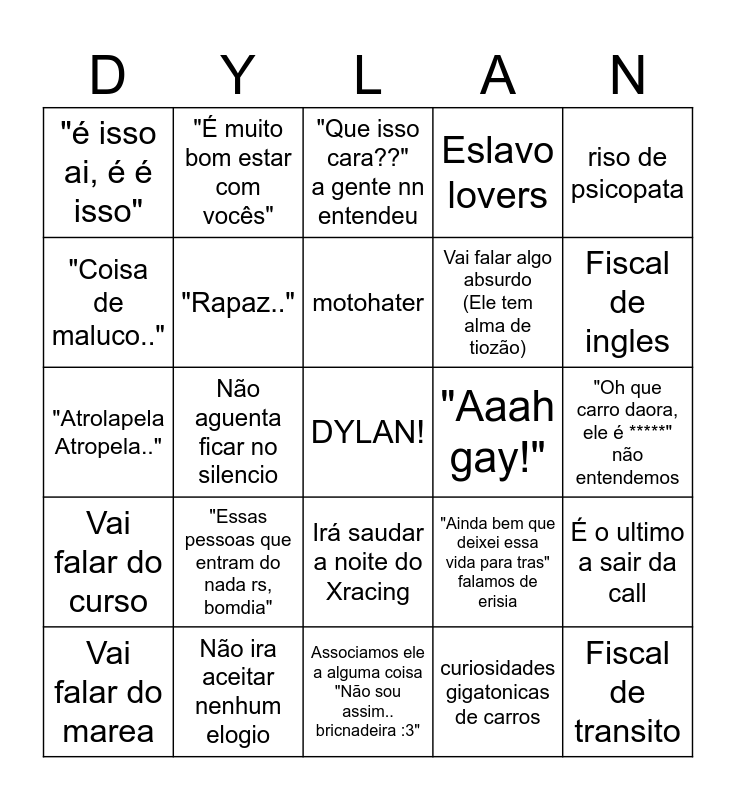 This bingo card has a free space and 24 words: Vai falar do marea, "Essas pessoas que entram do nada rs, bomdia", motohater, curiosidades gigatonicas de carros, riso de psicopata, "é isso ai, é é isso", "É muito bom estar com vocês", "Que isso cara??" a gente nn entendeu, "Aaah gay!", "Oh que carro daora, ele é *****" não entendemos, "Atrolapela Atropela..", "Rapaz..", "Ainda bem que deixei essa vida para tras" falamos de erisia, É o ultimo a sair da call, "Coisa de maluco..", Não ira aceitar nenhum elogio, Associamos ele a alguma coisa "Não sou assim.. bricnadeira :3", Eslavo lovers, Fiscal de ingles, Vai falar do curso, Não aguenta ficar no silencio, Irá saudar a noite do Xracing, Vai falar algo absurdo (Ele tem alma de tiozão) and Fiscal de transito.
