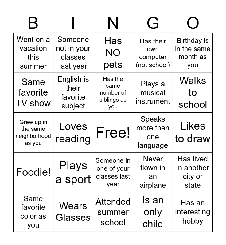 This bingo card has a free space and 24 words: Plays a sport, Wears Glasses, Has the same number of siblings as you, Same favorite color as you, Birthday is in the same month as you, Went on a vacation this summer, Same favorite TV show, Someone not in your classes last year, Speaks more than one language, Someone in one of your classes last year, Plays a musical instrument, Grew up in the same neighborhood as you, Never flown in an airplane, Has lived in another city or state, English is their favorite subject, Is an only child, Likes to draw, Has NO pets, Walks to school, Loves reading, Has an interesting hobby, Foodie!, Has their own computer (not school) and Attended summer school.