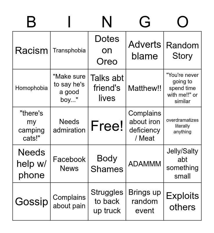 This bingo card has a free space and 24 words: Facebook News, Complains about pain, Talks abt friend's lives, Gossip, Random Story, Racism, Homophobia, Transphobia, Complains about iron deficiency / Meat, Body Shames, Matthew!!, "there's my camping cats!", ADAMMM, Jelly/Salty abt something small, "Make sure to say he's a good boy...", Brings up random event, overdramatizes literally anything, Dotes on Oreo, "You're never going to spend time with me!!" or similar, Needs admiration, Exploits others, Needs help w/ phone, Adverts blame and Struggles to back up truck.