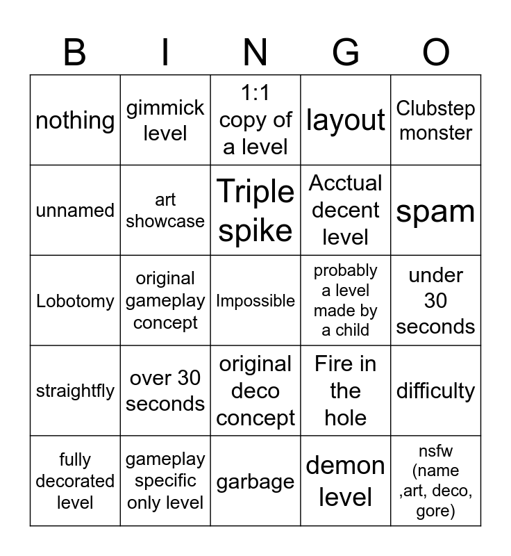 This bingo card has a free space and 24 words: over 30 seconds, gameplay specific only level, Triple spike, fully decorated level, Clubstep monster, nothing, unnamed, gimmick level, probably a level made by a child, original deco concept, Acctual decent level, Lobotomy, Fire in the hole, difficulty, art showcase, demon level, under 30 seconds, 1:1 copy of a level, spam, original gameplay concept, nsfw (name ,art, deco, gore), straightfly, layout and garbage.