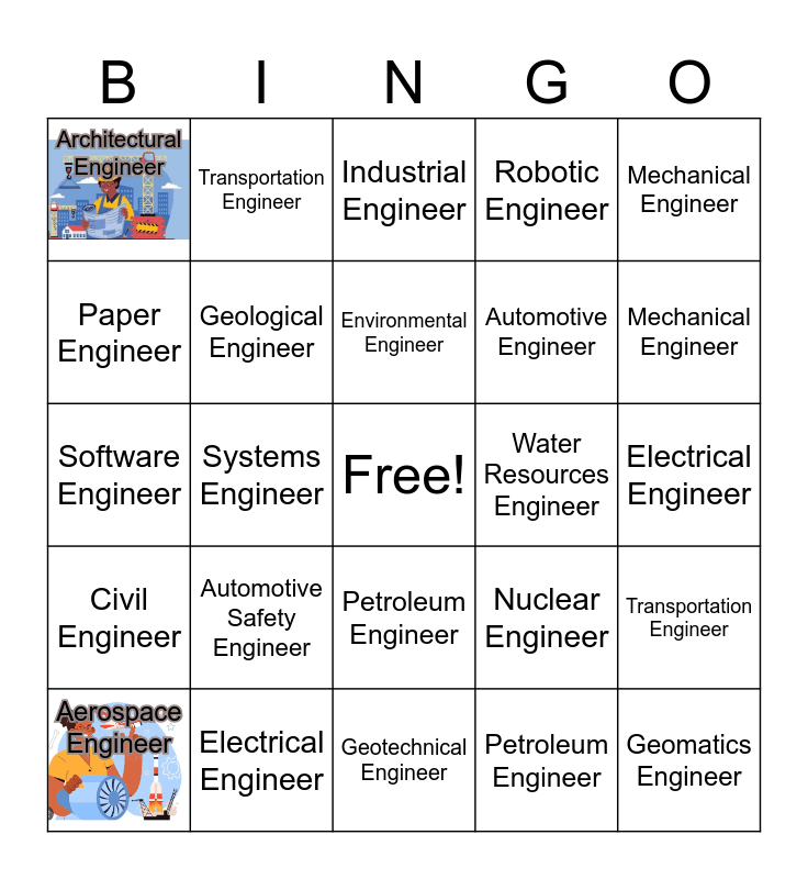 This bingo card has 5 images, a free space and 58 words: Manufacturing Engineer, Electrical Engineer, Computer Engineer, Civil Engineer, Petroleum Engineer, Marine Science Engineer, Geological Engineer, Materials Science Engineer, Automotive Engineer, Chemical Engineer, Robotic Engineer, Biochemical Engineer, Sound Engineer, Agriculture Engineer, Software Engineer, Architectural Engineer, Geomatics Engineer, Mechanical Engineer, Telecommunications Engineer, Environmental Engineer, Water Resources Engineer, Industrial Engineer, Aerospace Engineer, Transportation Engineer, Aerospace Engineer, Electrical Engineer, Materials Engineer, Agricultural Engineer, Mechanical Engineer, Electronics Engineer, Biomedical Engineer, Environmental Engineer, Geological/Mining Engineer, Chemical Engineer, Civil Engineer, Coastal Engineer, Robotics Engineer, Systems Engineer, Software Engineer, Structural Engineer, Automotive Safety Engineer, Systems Engineer, Nuclear Engineer, Mechatronics Engineer, Biotechnology Engineer, Optical Engineer, Acoustic Engineer, Petroleum Engineer, Geotechnical Engineer, Industrial Engineer, Computer Engineer, Marine/Ocean Engineer, Sports Engineer, Architectural Engineer, Transportation Engineer, Nanotechnology Engineer, Paper Engineer and Food Engineer.