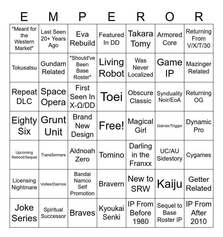 This bingo card has a free space and 48 words: New to SRW, Game IP, Kyoukai Senki, Grunt Unit, First Seen In X-Ω/DD, Dynamic Pro, Last Seen 20+ Years Ago, Spiritual Successor, Armored Core, Tomino, Returning From V/X/T/30, Featured In DD, Synduality Noir/EoA, Obscure Classic, Licensing Nightmare, Gainax/Trigger, Tokusatsu, Mazinger Related, Kaiju, Takara Tomy, Was Never Localized, Brand New Design, "Meant for the Western Market", Gundam Related, Getter Related, "Should've Been Base Roster", Returning OG, Joke Series, Toei, Space Opera, Sequel to Base Roster IP, Magical Girl, Cygames, Voltes/Daimos, Eighty Six, Darling in the Franxx, UC/AU Sidestory, Repeat DLC, Aldnoah Zero, Bandai Namco Self Promotion, Upcoming Reboot/Sequel, IP From After 2010, Eva Rebuild, Braves, Living Robot, Bravern, Transformers and IP From Before 1980.