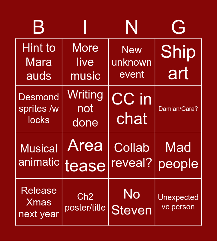 This bingo card has 16 words: Ch2 poster/title, Mad people, New unknown event, Hint to Mara auds, Musical animatic, More live music, Collab reveal?, No Steven, Desmond sprites /w locks, Writing not done, Release Xmas next year, Ship art, Area tease, Damian/Cara?, CC in chat and Unexpected vc person.