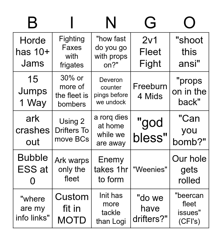 This bingo card has 64 words: Free!, Bash Ansi to get enemy to form, "where are the bombers", Our hole gets rolled, 3v1 Fleet Fight, More than 1 Fax on grid, Fighting Faxes with frigates, Horde Mega Cope Ping, Deveron counter pings before we undock, "waiting for the enemy to form", Enemy takes 1hr to form, "Every FC i fight is a bot", "Can you bomb?", "shoot this ansi", Zimbawe Safari Roam, 15 Jumps 1 Way, Using 2 Drifters To move BCs, Horde has 10+ Jams, "Reship get to the hole", Freeburn 4 Mids, Ark warps only the fleet, Bubble ESS at 0, 2v1 Fleet Fight, Booshes wrong fleet, Zack off anchor, Zigam Sits inside an ESS, The space pope joins (rare), horde gates 20 jumps with battleships, Cj Feeds a hic or sabre, "where are my dictors", Half of -7- in command 1, Broadcasts in Structure, Random russian in USTZ fleet, "shoot this links green", "props on in the back", "where are my info links", Story Time, "do we have drifters?", Farms noob FC, 30% or more of the fleet is bombers, ark crashes out, "god bless", Alexander is being pesemistic, Karmen Yells, Horde drops dreads mid fight to save themselves, a rorq dies at home while we are away, Custom fit in MOTD, "beercan fleet issues" (CFI's), "Weenies", 27 jump blue ball roam, Regales us with tales from the great war, Lemmings (free), Init has more tackle than Logi, Muninns in 2025, "GF in local" (we got a fleet fight), Dingdong Ditching enemy JB, "how fast do you go with props on?", "FC whats preload", "Whats your Range with X ammo", 2+ Hour Fleet, 1B+ Pod dies, Red cyno dies before they load grid, Hordes story time is a gigaspin (common) and Goons treating RNI's like T1 Bcs.